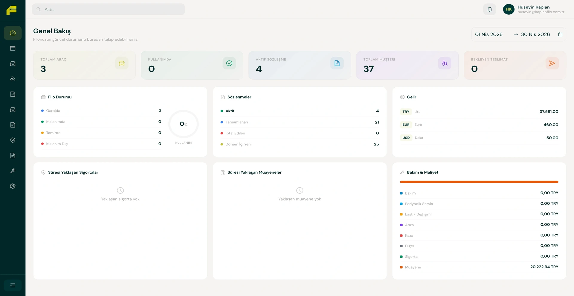 Rent a car ve filo yönetim süreçlerinizi tek platformda dijitalleştirin. KABIS bildirim desteği, araç takibi, kiralama sözleşmeleri ve gelişmiş raporlama ile işinizi büyütün.